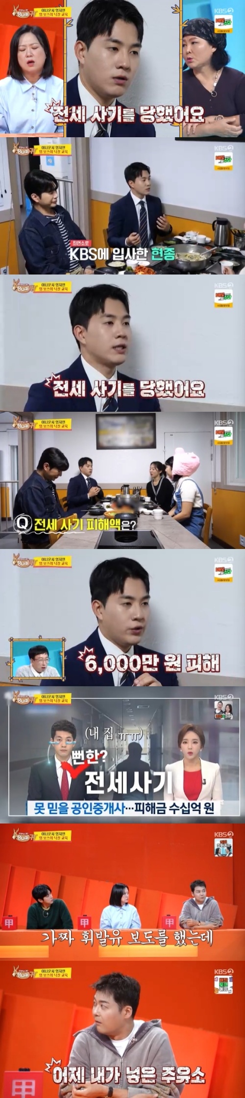 선배 엄지인 아나운서는 "전세 사기 당하고 다음날 출근해서 뉴스할 때, '창원 오피스텔에서 전세 사기가 일어났다'며 자기 얘기를 직접 뉴스에서 보도했다"고 말해 놀라움을 자아냈다. 이에 전현무도 "나도 그런 적 있다. 뉴스 하는데 '가짜 휘발유' 소식을 보도하는데 내가 어제 넣은 곳이었다. 깜짝 놀랐다. 아나운서가 헛똑똑이들이 많다"고 설명했다. 엄지인은 "그만큼 더 열심히 하는 현종이다. 시작부터 마이너스 6천이었다"고 덧붙였다.