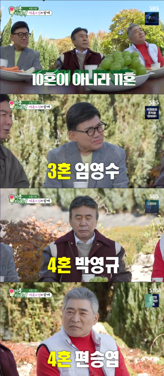 [OSEN=박근희 기자] '미운 우리 새끼’ 개그맨 엄영수, 배우 박영규, 가수 편승엽이 방송에 출연해 각자의 결혼 이력을 솔직하고 유쾌하게 공개했다.