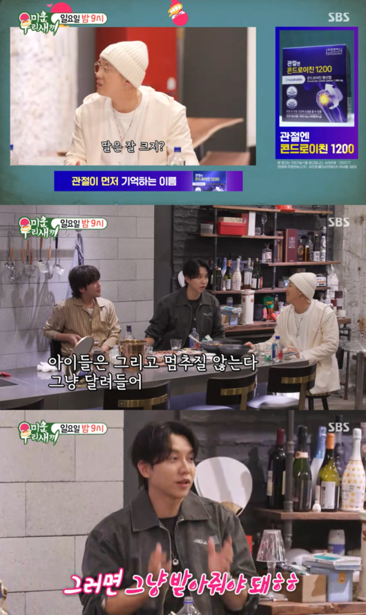 이승기는 육아의 '현실'에 대한 솔직한 심경도 전하며 웃음을 안겼다. 그는 "아이들은 그리고 멈추질 않는다. 그냥 달려들어. 그러면 그냥 받아줘야 돼"라고 말해 웃음을 자아냈다.
