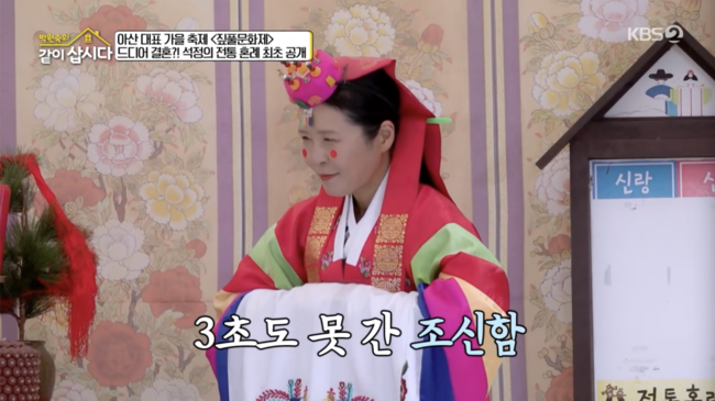 홍진희는 “혼례복 입어볼래? 내가 너 시집 보내줄게”라며 황석정의 손을 잡아 이끌었고, 황석정이 관심을 보이자 언니들을 빠르게 움직였다. 실제로 홍진희의 부모님이 전통혼레를 치르기도 했다고.