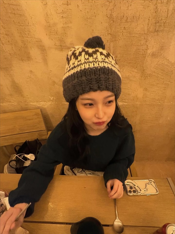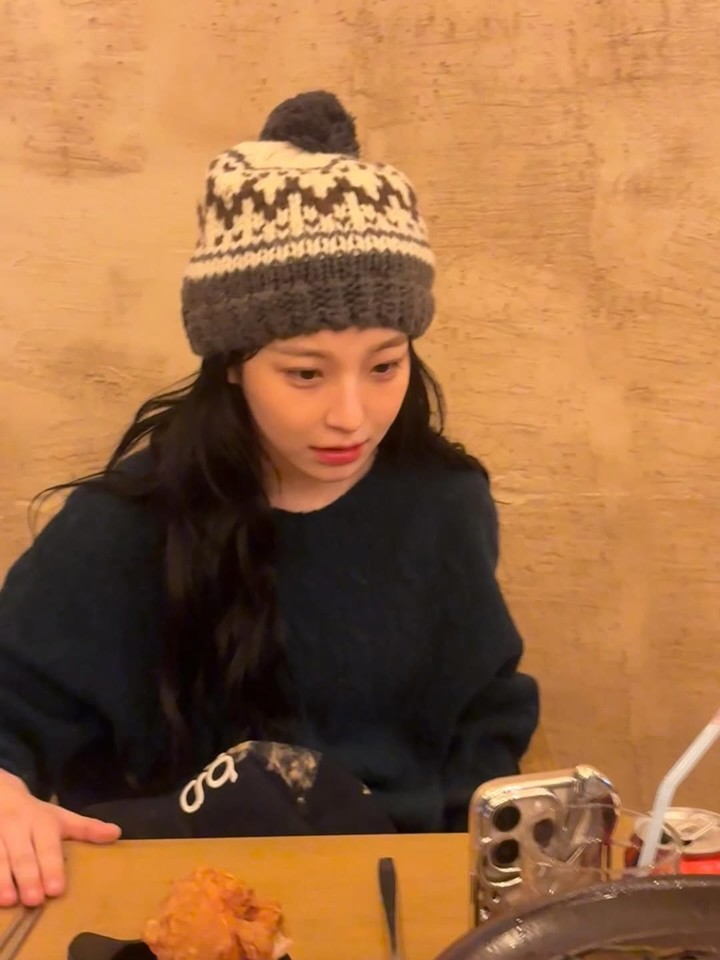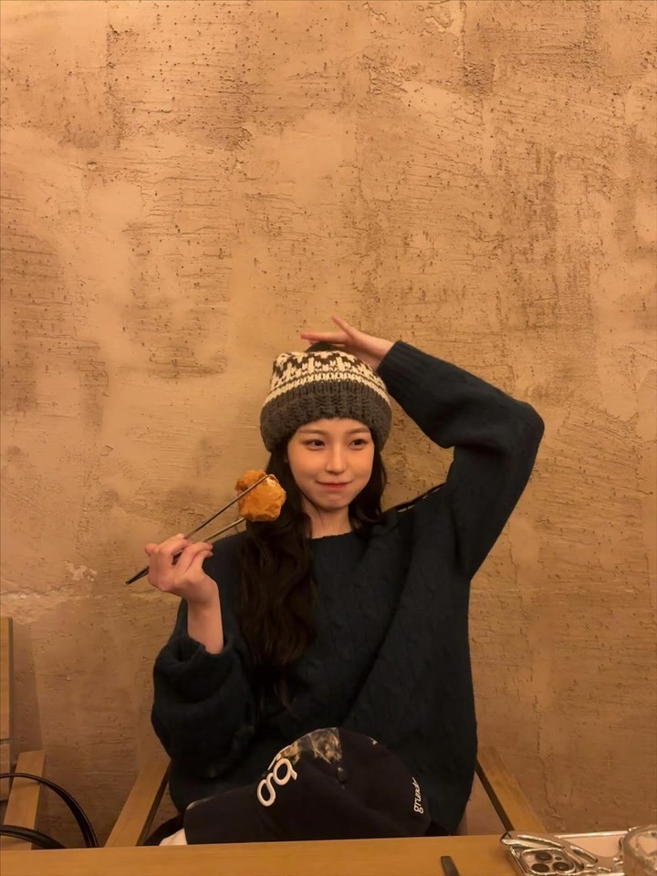 또 다른 컷에서는 털 모자를 쓴 채 치킨을 젓가락으로 집어 들고 다양한 포즈를 취하고 있다.