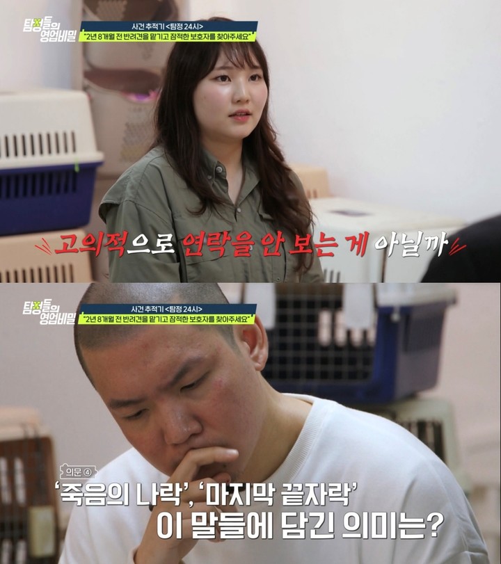 센터 측의 지속적인 연락과 최후통첩에 보리 보호자는 "죽음의 나락", "마지막 끝자락" 등 의미심장한 메시지를 보내와 신변 이상 여부에 대한 불안감을 키웠다. 그러나 의뢰인은 "아프다고 연락은 피하면서 프로필 사진은 꾸준히 바꿨다"며 고의적인 회피 의혹을 제기하기도 했다. 이에 부자 탐정단은 보리를 맡길 당시 보호자가 직접 작성한 계약서상의 주소지로 찾아가 탐문을 시작했다.