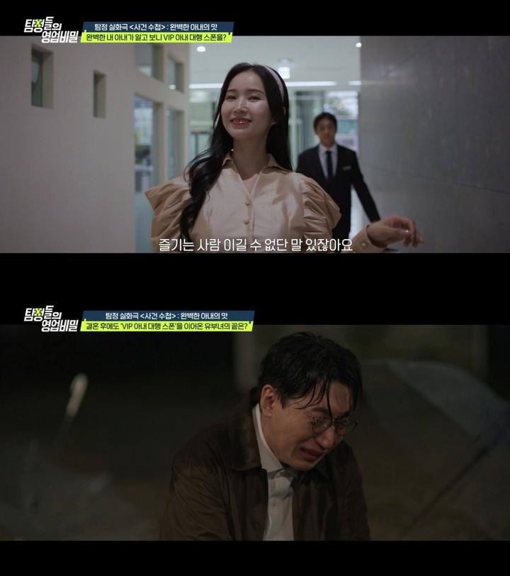 알고 보니 의뢰인의 아내는 프랜차이즈 회사 CEO, IT 벤처 기업 대표, 로펌 대표 등 5명의 남성에게 '아내 대행'을 하며 스폰을 받고 있었다. 회장들의 아내 역할을 하며 백화점 명품관, 비행기 퍼스트 클래스, 미슐랭 레스토랑 등을 드나드는 일명 'VIP 놀이'에 빠져 헤어나오지 못한 것이었다. 모든 사실이 드러난 뒤, 의뢰인과 아내는 결국 이혼으로 결말을 맞았다. 역대급 스토리에 스튜디오는 충격에 빠졌다.