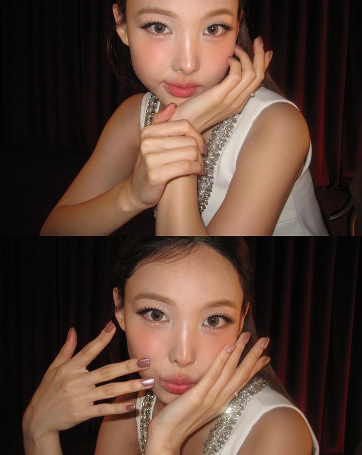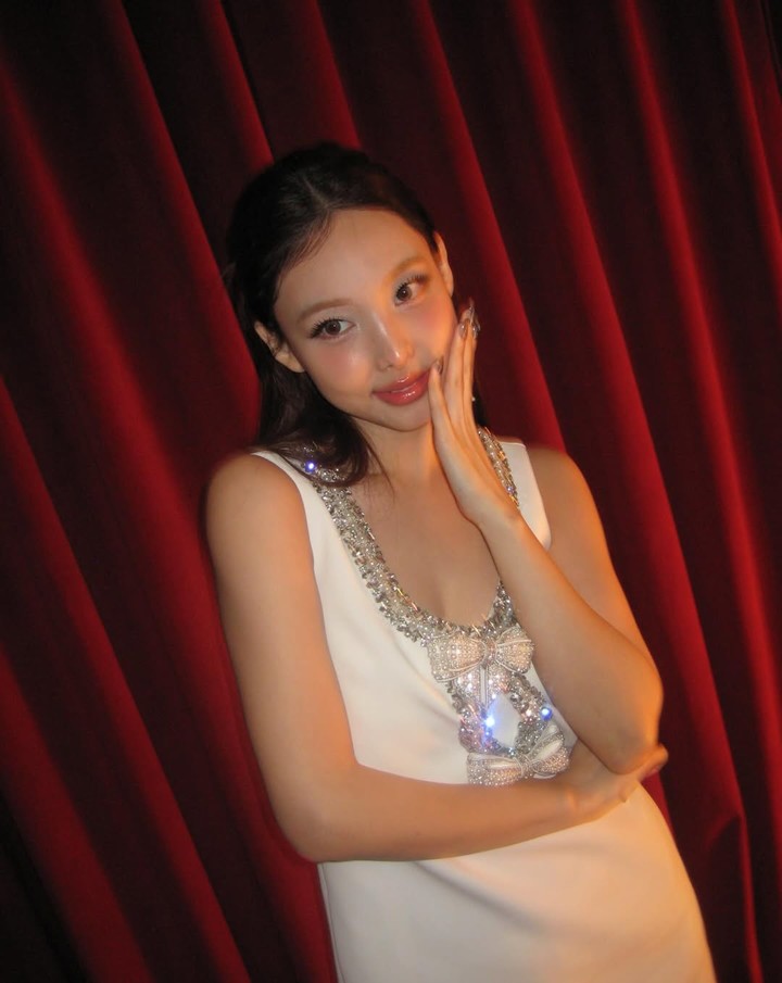 또 다른 사진에서는 반짝이는 리본 장식과 시퀸 디테일이 조명에 반사돼 화려하게 빛나고, 나연은 한 손으로 볼을 감싸 쥔 채 수줍게 미소 지어 ‘연말 파티 여신’ 같은 비주얼을 완성했다.