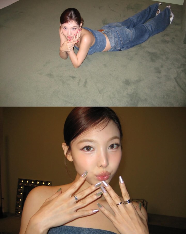 이어진 컷에서는 데님 튜브톱이 슬림한 어깨와 쇄골 라인을 강조했고, 양손 가득 채운 반지와 길게 뻗은 손가락이 네일 화보를 연상케 했다. 장난스러운 표정과 함께 살짝 내민 입술이 러블리한 분위기를 더한다.