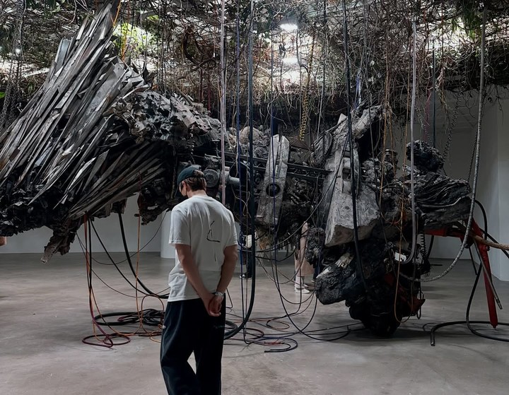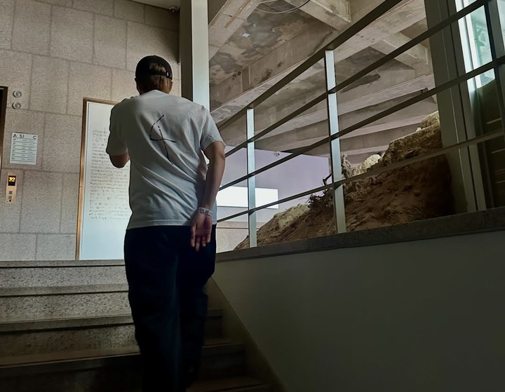 이후엔 전시 공간에서 작품을 감상하는 모습도 담겼다. 흰 티셔츠 차림에 손을 등 뒤로 모은 채 진지하게 설치미술 앞에 선 모습에서 RM 특유의 차분하고 깊이 있는 분위기가 전해진다.