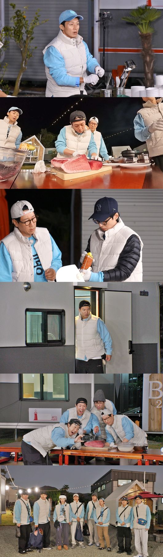 낭만 숙소에 흠뻑 반한 것도 잠시, 멤버들은 울리는 배꼽시계를 느끼고 저녁 식사 준비에 돌입했다. 바리바리 들고 온 신선한 통영 식재료 중에서도 특히 참치 양식장에서 받아온 생참치 덩어리의 황홀한 비주얼이 눈길을 끌었는데 식재료의 축복에 ‘런닝맨 공식 요리사’ 양세찬과 자칭 ‘이연복 왼팔’ 허경환은 물론, ‘요.알.못’ 멤버들까지 요리 욕심을 불태우며 일명 ‘런마카세’에 도전했다.