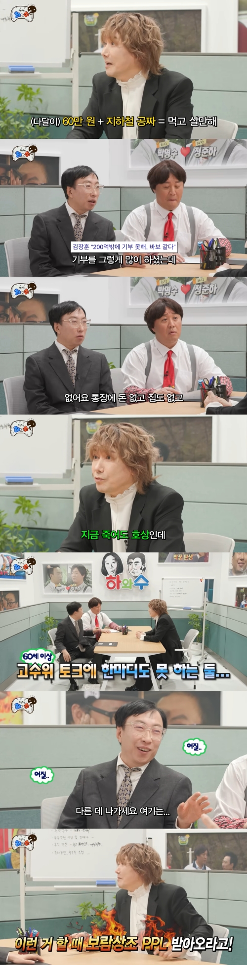 박명수는 "기부를 그렇게 많이 하셨는데 어렵게 사는 연예인으로 웹예능에도 나왔다"며 궁금해했다. 무려 200억 원을 기부한 것으로 알려진 김장훈은 "아니 그 재산은 10원도 없다. 통장에 돈 없고 집도 없다. 근데 (생활 등이) 어렵진 않다"고 밝혔다.