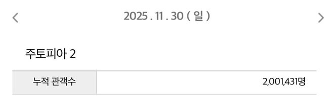 영화관입장권 통합전산망에 따르면 '주토피아 2'는 11월 30일(일) 오후 3시 34분 기준 누적 관객수 2,001,431명을 돌파하며 개봉 5일째 200만 관객을 넘어섰다. 이는 올해 최고 흥행작인 '극장판 귀멸의 칼날: 무한성편'과 함께 최단기간 200만 돌파 기록은 물론 '겨울왕국 2' 이후 11월 개봉작 중 6년 만에 가장 빠른 속도로 그 의의를 더하고 있다.