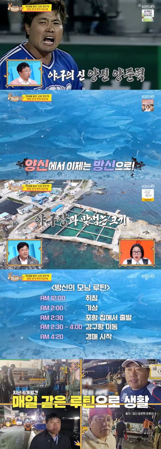 ‘양신’에서 ‘방신’으로 변신한 양준혁은 끝까지 밀어붙인 양식 사업에 대해 “제가 구룡포 대방어 감독이다. 야구장 만한 양식장에 1만 2천 마리 기르고 있다. 노량진 수산시장에 경매에 내서 1kg당 3만 8천원 최고가를 경신했다. 방어는 제가 꽉 잡았다”라고 자부해 놀라움을 자아냈다.