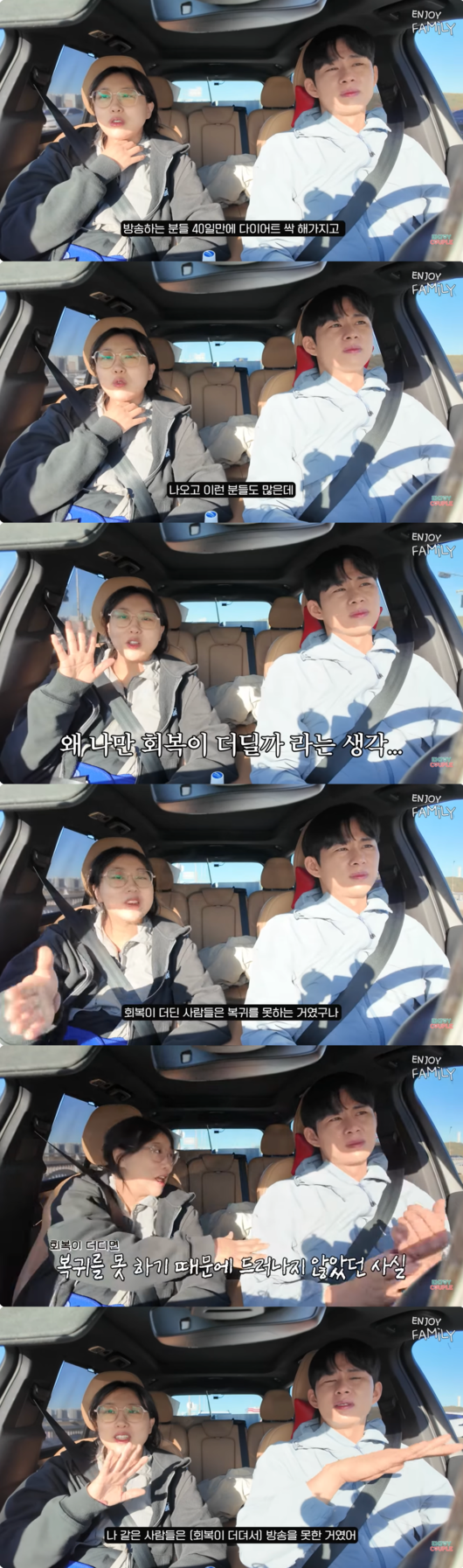 임라라는 자신의 더딘 회복 속도에 대해 고민했던 사실을 털어놓기도. 임라라는 "방송하는 분들 40일 만에 다이어트 싹 해가지고 나오고 이런 분들도 많은데 '왜 나만 (회복이 더딜까)' 이런 생각도 있었다"라고 고백했다.