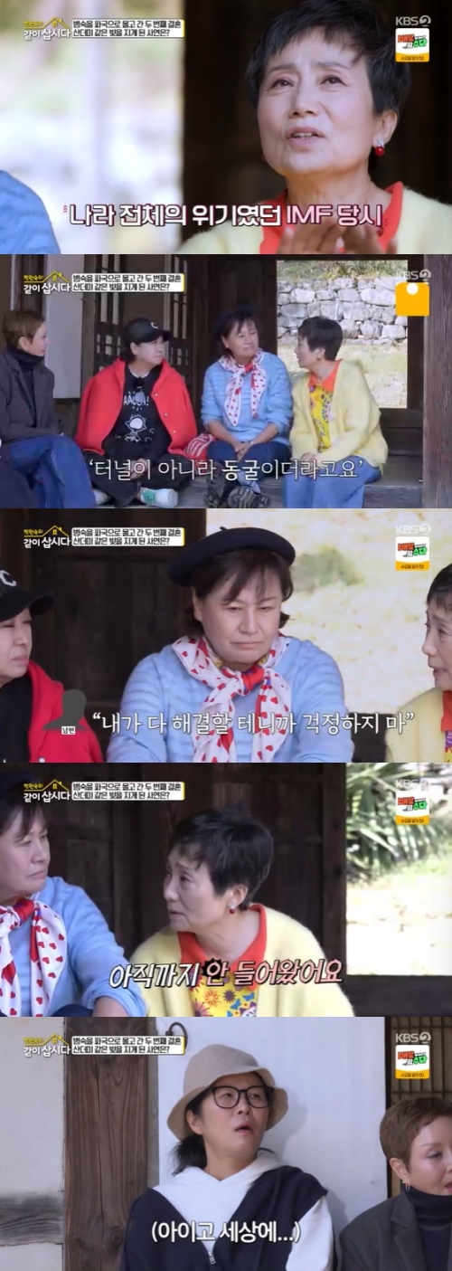 이어 "그때가 안 잊혀진다. 나라가 전체가 IMF가 됐는데, 나라가 위기를 겪을 때 나도 전쟁을 겪었다. 터널이 아니라 동굴이더라. 터널은 출입구라도 있는데 동굴은 가도 가도 지하였다"며 "회사가 부도날 때 남편이 '내가 다 해결할테니까 걱정하지마. 한달 뒤에 들어올게'라고 했는데, 아직까지도 안 들어왔다"고 말해 모두를 놀라게 했다.
