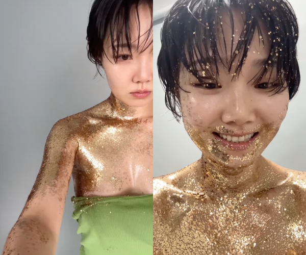 영상에서 손수아는 헤어와 메이크업을 한 뒤 온 몸에 금빛 반짝이를 붙이고 있는 모습이다. 어깨와 팔 뿐 아니라 목, 얼굴, 머리까지 금빛 반짝이를 붙였다.