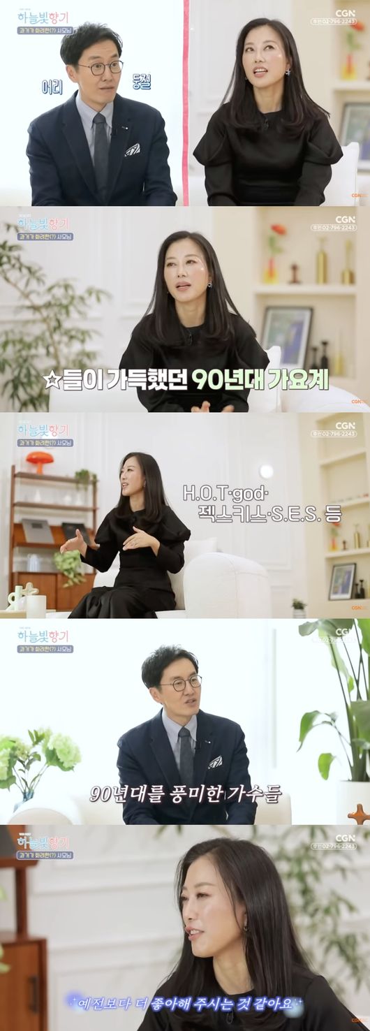김현정은 지난 2일 유튜브 채널 'CGN'에 공개된 '하늘빛향기' 7편에 게스트로 출연했다. 그는 '90년대 대표 가수에서 사모로, 그리고 다시 가수로 재취업(?)한 사연'이라는 제모의 영상에서 김재원 아나운서, 개그맨 송필근을 만나 이야기를 나눴다.