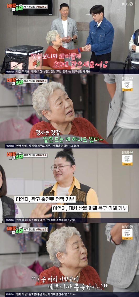 3일 방송된 KBS 2TV 예능 ‘배달왔수다’에서는 강부자와 이영표가 주문자로 등장했다.