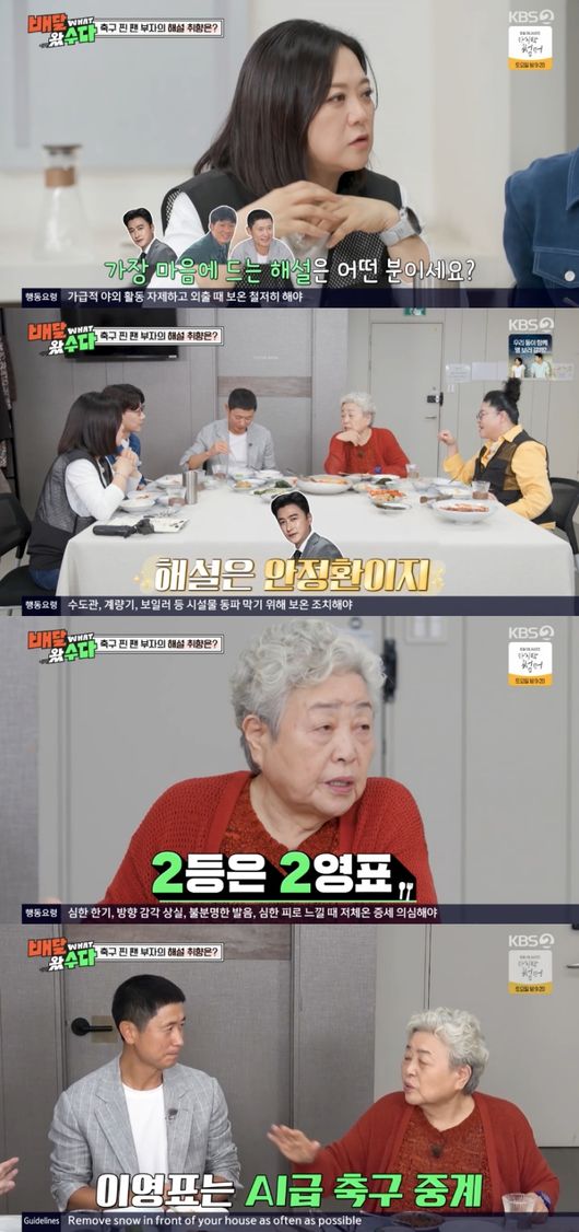 이영표는 “제가 중계할 때 바꿔야 할 게 있냐”고 물었다. 강부자는 “너무 매끄럽게 한다. 가끔은 우스갯소리도 하고 해야 한다”라고 조언했다. 이에 이영표는 “너무 정확하다. 제가 봐도 안정환은 재밌다. 정말 신기한 게 경기가 비기거나 지고 있으면 KBS로 온다. 경기가 이기면 안정환한테 간다”라고 설명했다.