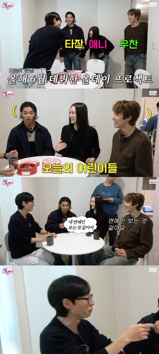 4일 오후 유튜브 채널 '뜬뜬'에는 '미니 핑계고'가 공개됐다. 이날 영상에는 올데이프로젝트의 타잔, 애니, 우찬이 게스트로 출연해 MC 유재석을 만났다.