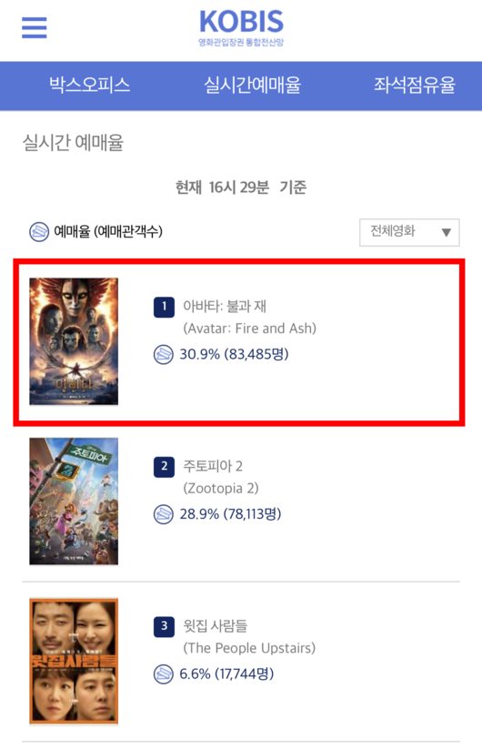 영화관입장권 통합전산망에 따르면 '아바타: 불과 재'가 전체 예매율 1위에 등극했다. 이는 월드와이드 역대 흥행 순위 1위를 16년째 지키고 있는 '아바타' 시리즈다운 저력을 보여줌과 동시에 국내 관객들의 뜨거운 기대감을 체감할 수 있는 결과로 주목받고 있다. 더욱이 '아바타: 불과 재'는 올 연말 최고의 화제작이자 기대작으로 주목받고 있는 만큼, 앞으로의 흥행 추이에도 주목된다.