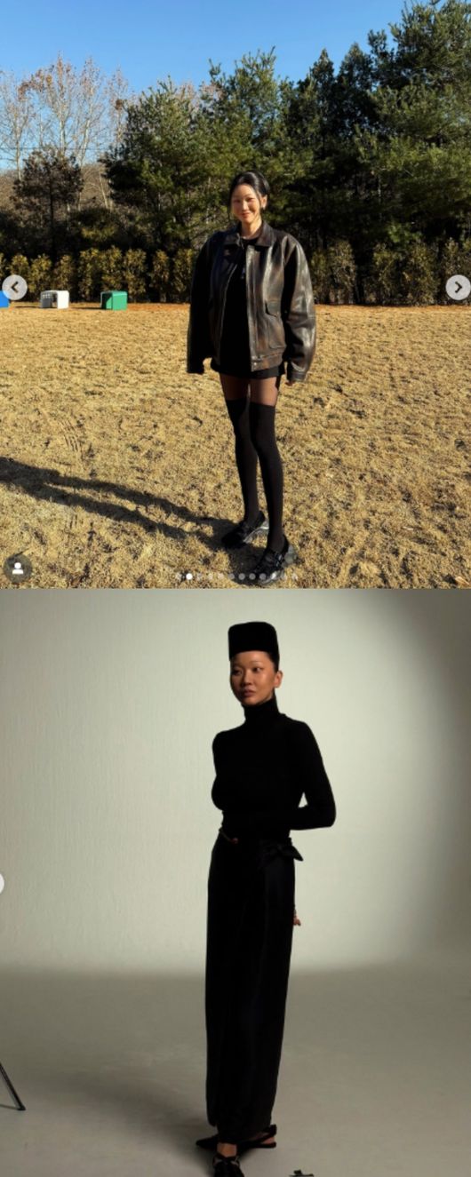 또 장윤주는 미니 팬츠에 가죽재킷을 입고 야외에서 포즈를 취하거나 몸매 라인이 드러나는 올블랙에 독특한 모자를 매치한 난해한 룩도 완벽히 소화한 모습을 담았다.