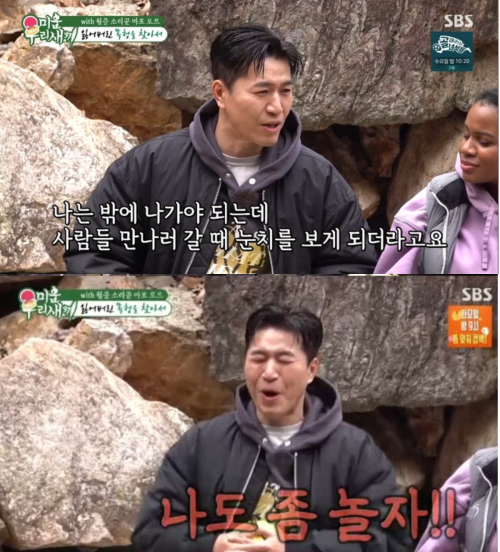 그러자 김종민도 강하게 공감하며 “나랑 똑같다. 신기하다”고 말했다. 이어 그는 “사람들 만나러 갈 때 눈치 보게 된다. 여보 나도 좀 놀자”라고 외쳐 모두를 폭소케했다.