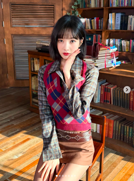 공개된 사진 속 조이는 미니스커트에 셔츠와 니트조끼를 매치해 따뜻한 분위기의 겨울룩을 선보였다. 책장을 배경으로 포즈를 취한 그는 똑단발 헤어스타일로 귀여운 매력을 물씬 풍겼다.