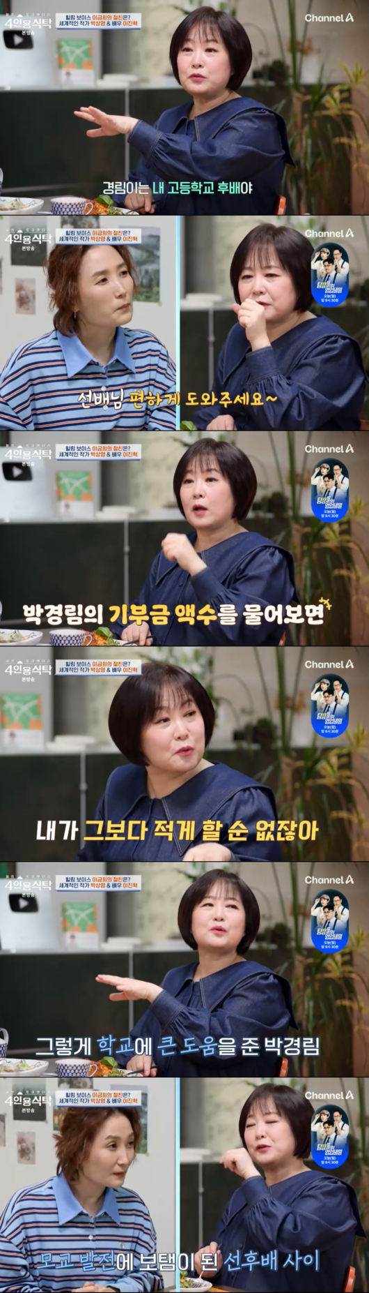 이금희의 선행 언급을 들은 박경림은 "선배님은 도서관도 지어주시고"라며 맞장구쳤고, 이금희의 엄청난 배포를 자랑스럽게 언급했다.