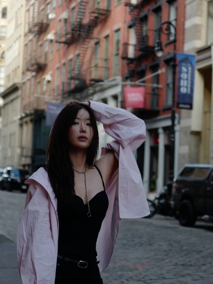 블랙 이너에 핑크 오버사이즈 셔츠를 툭 걸쳐 도시적인 쿨함을 강조했고, 얇은 체인 목걸이로 포인트를 더해 미니멀한 섹시미를 살렸다. 또 다른 사진에서는 가죽 재킷과 스트라이프 머플러로 톤을 낮춰, 클래식하면서도 자유로운 ‘시티 걸’ 무드를 완성했다.