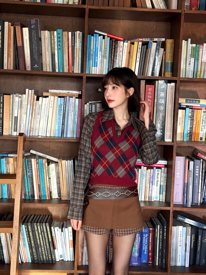 공개된 사진 속 조이는 체크 셔츠와 브라운 미니스커트를 매치하고, 버건디 컬러의 아가일 니트 베스트를 더해 클래식한 무드를 연출했다.