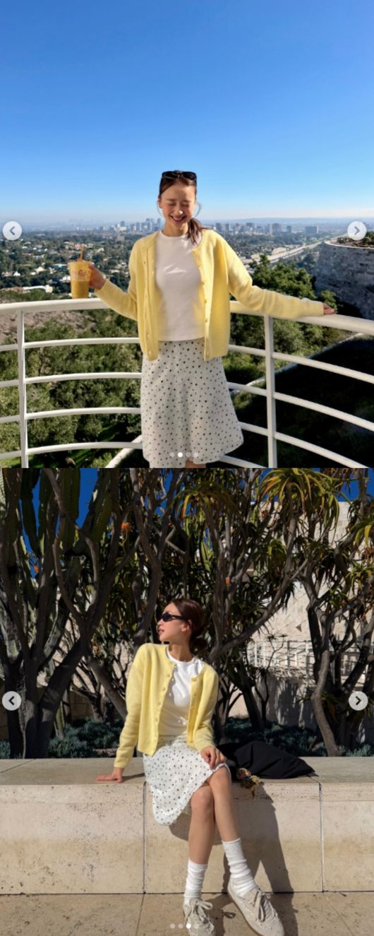 공개된 사진 속 손연재는 따뜻한 햇살 아래 노란 가디건과 도트패턴 스커트를 매치해 산뜻한 분위기를 자아냈다. 선글라스를 착용한 채 벤치에 앉아 여유를 즐기는 모습을 담았다.