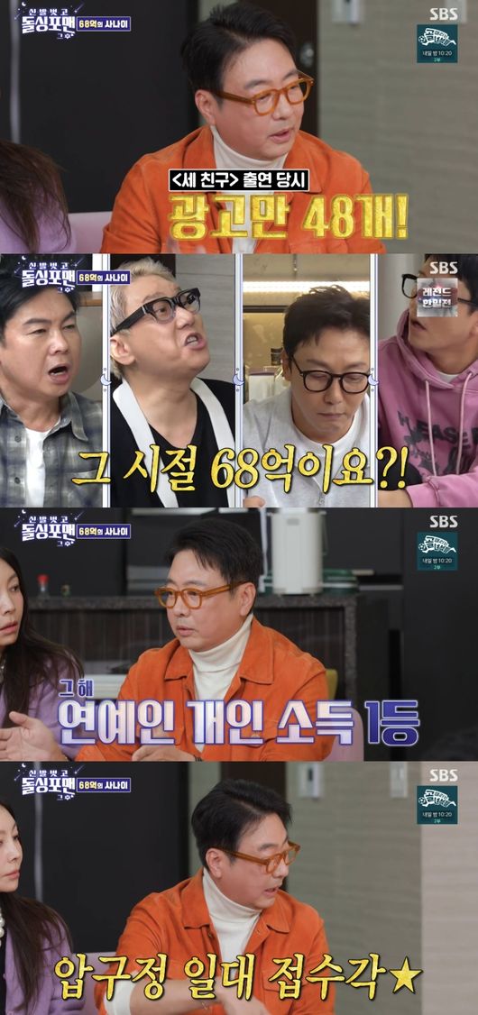 윤다훈은 “‘세 친구’ 출연 당시 광고 찍었는데 48개를 찍었다. 1년에. 그때 2000년도 소득신고 했는데 68억 벌었다. 개인으로 연예인으로 번 것도 1등이었다. 48개 광고 찍은 것도 한국 기네스북에 올랐다”라고 밝혀 모두를 놀라게 했다.