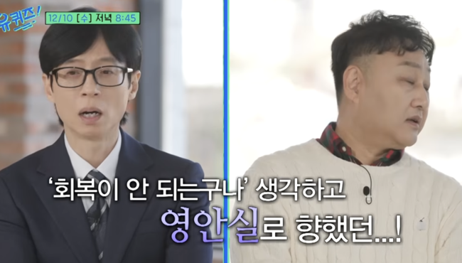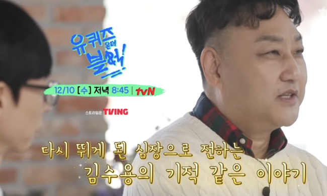 이와 함께 김수용은 tvN ‘유 퀴즈 온 더 블럭’을 통해 심정지 당시의 긴박했던 상황도 공개한다. 9일 공개된 예고 영상에서 유재석은 김수용을 “생사의 고비를 넘기고 돌아온 기적의 수드래곤”이라고 소개하며 “매니저에게 ‘김수용 형님 심정지 왔다’는 전화를 받고 말이 안 나왔다”고 당시를 떠올렸다.
