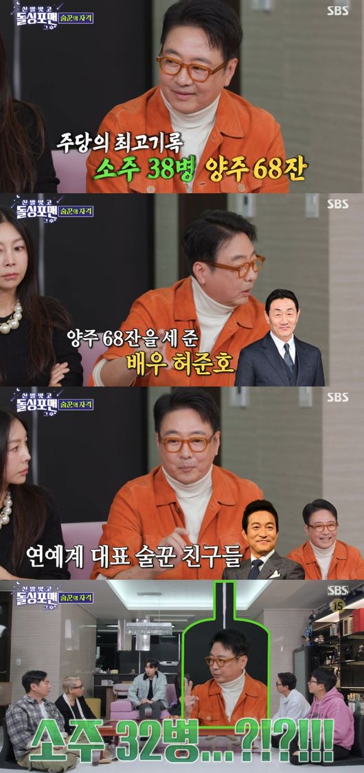 이상민은 “주종 따지지 않고 7차까지 간다는데 소문이 진짜 맞냐”고 물었다. 윤다훈은 “한창 어렸을 때 술 마셨는데 68잔을 세 준 배우가 허준호다. 술을 못 마셔서 제 술을 만들어주면서 세줬는데 68잔”이라고 진실이라고 밝혔다.