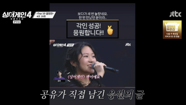 방송 이후 공유는 자신의 SNS에 “보다가 세 번 놀랐다”는 글과 함께 ‘싱어게인4’ 방송 장면을 캡처해 올리며 응원 메시지를 전했다. 특히 “안타까운 사고 이야기와 함께 부른 ‘진심’이 와 닿았다. 각인 성공! 응원합니다!!”라는 댓글을 남겨 화제를 모았다.