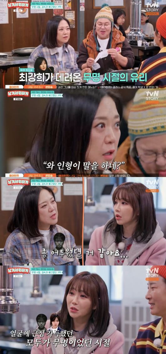 김숙은 “20년 넘었다. 내가 그때 일이 없어서 집에 누워있었다. 최강희가 너무 예뻐하는 동생이라고 데리고 왔다. 유리가 완전 신인 때였는데 인형이었다. 너무 예뻤다”라고 회상했다.