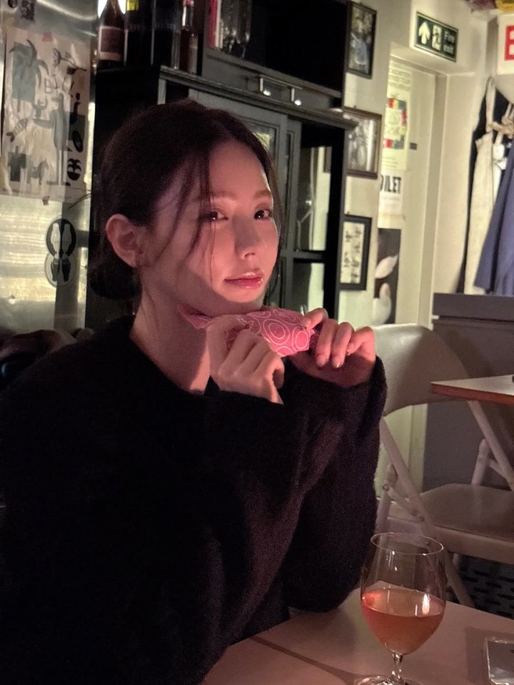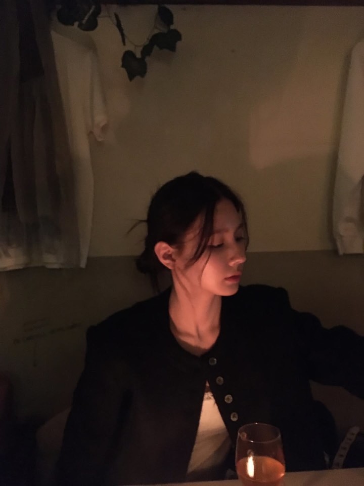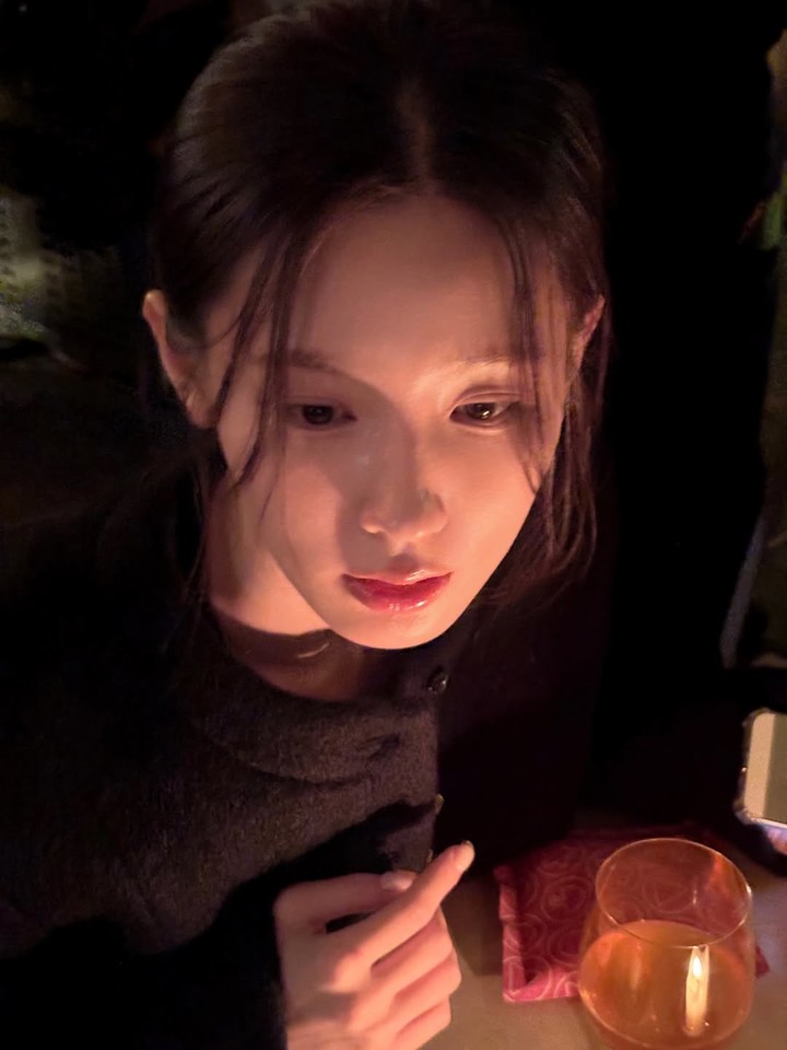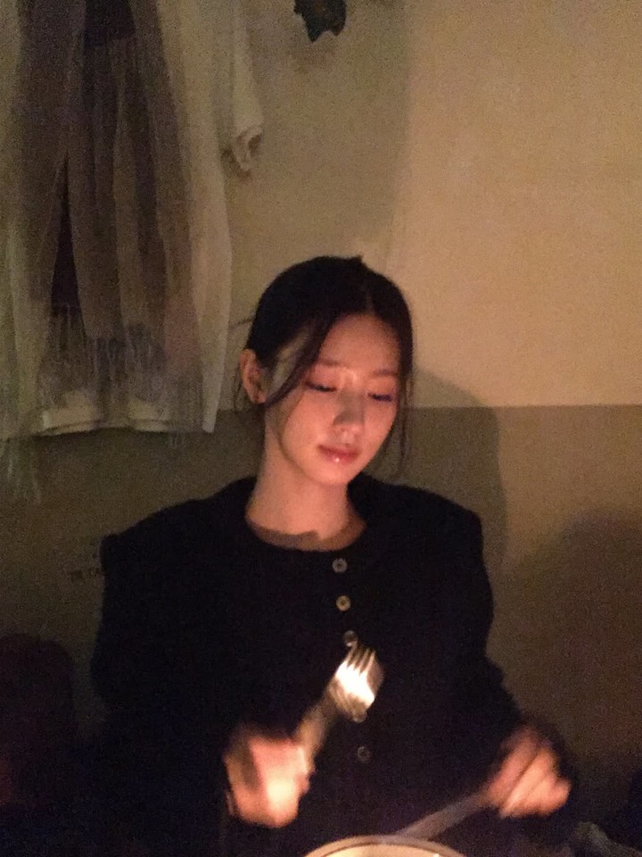 이어진 사진에서는 어두운 조명 아래 테이블 위에 놓인 촛불만이 미연의 얼굴을 비추고 있다. 아늑한 조명 속에서 포크를 쥔 채 음식을 준비하는 모습이 담겨, 데이트 현장을 엿보는 듯한 설렘을 자아낸다.