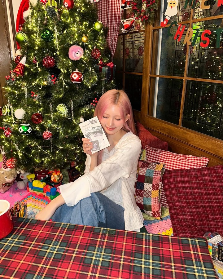 책을 펼쳐 들고 트리 옆 바닥에 앉아있는 컷에서는 소녀 같은 분위기를 자아냈다. 내추럴한 아이 메이크업과 뽀얀 피부가 어우러져 ‘민낯 같은’ 청순미를 돋보이게 했다.