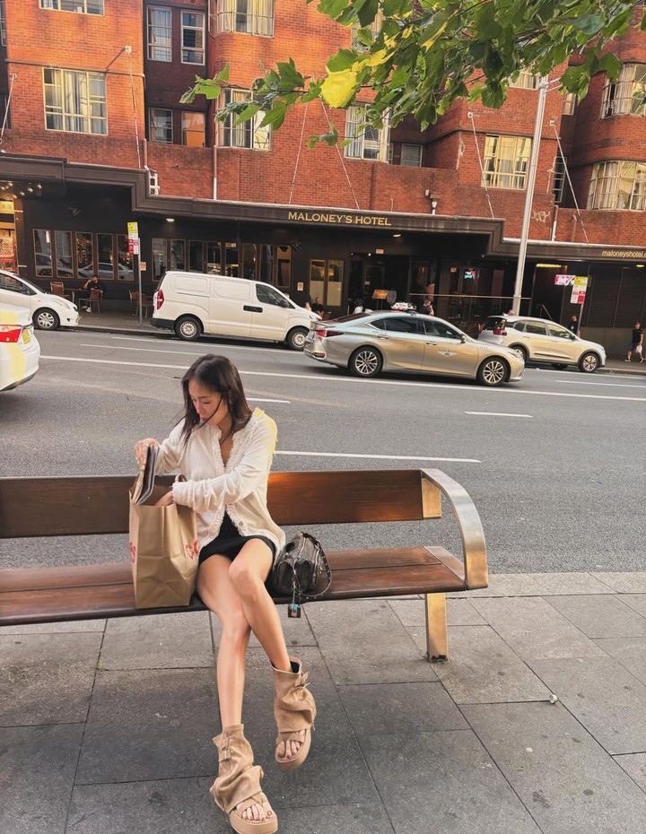 벤치에 다리를 꼰 채 앉아 있는 모습만으로도 늘씬한 각선미가 돋보이고, 발에는 독특한 실루엣의 베이지 컬러 부츠 샌들을 신어 힙한 포인트를 더했다.