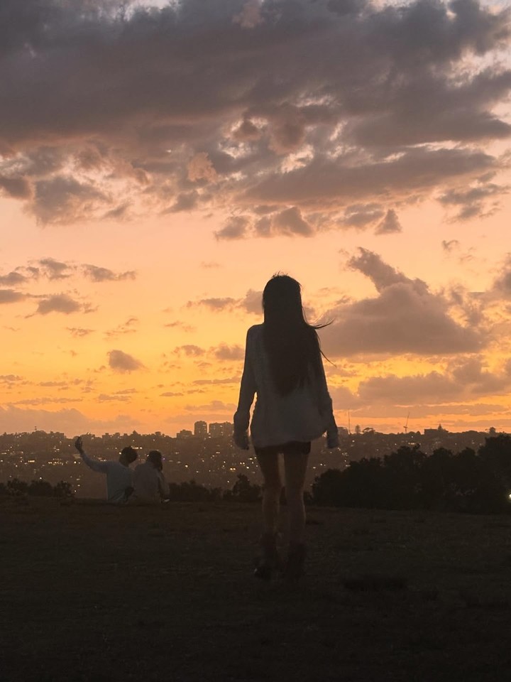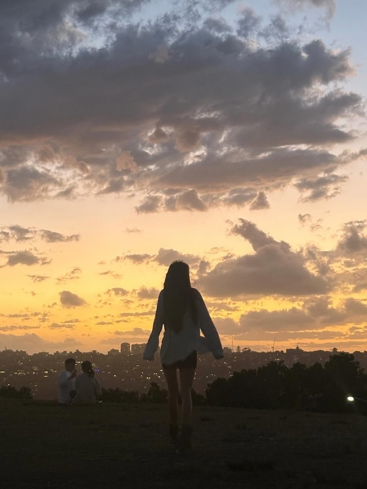 노을이 물든 언덕 배경의 사진에서는 오버핏 화이트 니트 톱과 미니 팬츠를 착용한 채 뒷모습만으로 분위기를 완성했다. 석양을 등진 실루엣이 마치 로맨스 영화의 한 장면을 연상시켜 눈길을 끈다.