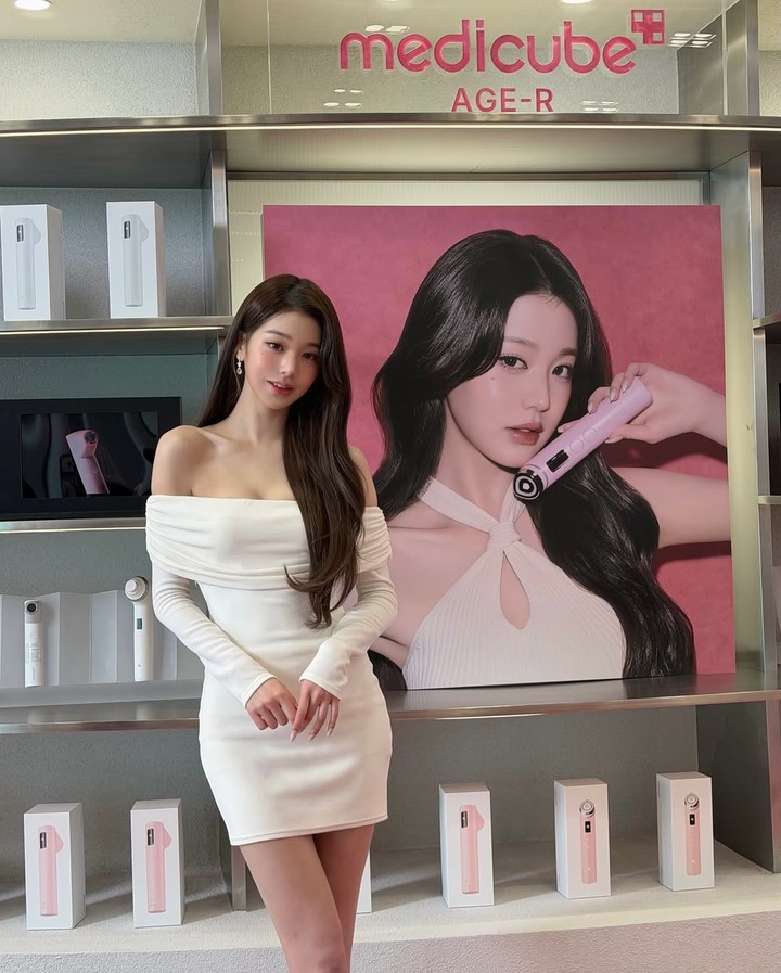 아이브 멤버 장원영은 지난 11일 개인 SNS를 통해 여러 장의 사진을 게재했다. 공개된 사진 속 장원영은 오프숄더 디자인의 타이트한 화이트 드레스를 입고, 뷰티 전시 공간에서 포즈를 취하고 있다.