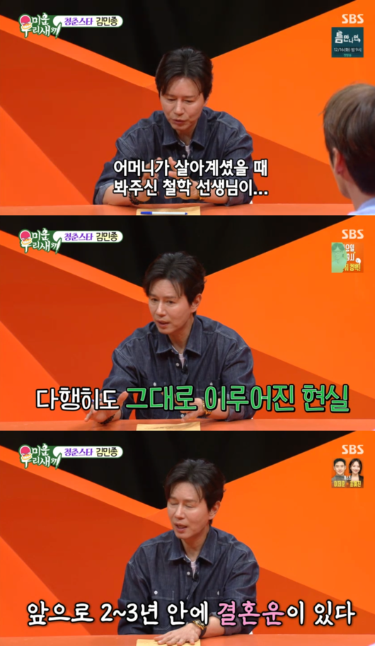 [OSEN=박근희 기자] '미운 우리 새끼’ 배우 김민종이 돌아가신 어머니께서 봐주신 철학관의 예언이 놀랍게도 현실이 되고 있다고 밝히며, 조만간 결혼운까지 이어질지에 대한 기대감을 드러냈다.