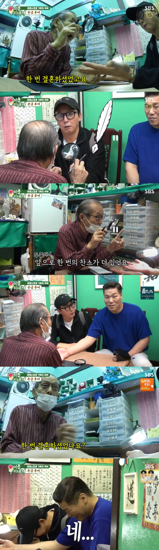 [OSEN=박근희 기자] '미운 우리 새끼’ 탁재훈과 서장훈이 손금 투어에 나섰고, 점술가가 손금을 보자마자 두 사람의 과거 결혼 사실을 정확히 맞혀 모두를 놀라게 했다.