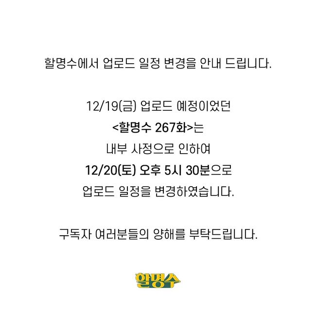 12/19(금) 업로드 예정이었던 <할명수 267화>는 내부 사정으로 인하여 12/20(토) 오후 5시 30분으로 업로드 일정을 변경하였습니다.