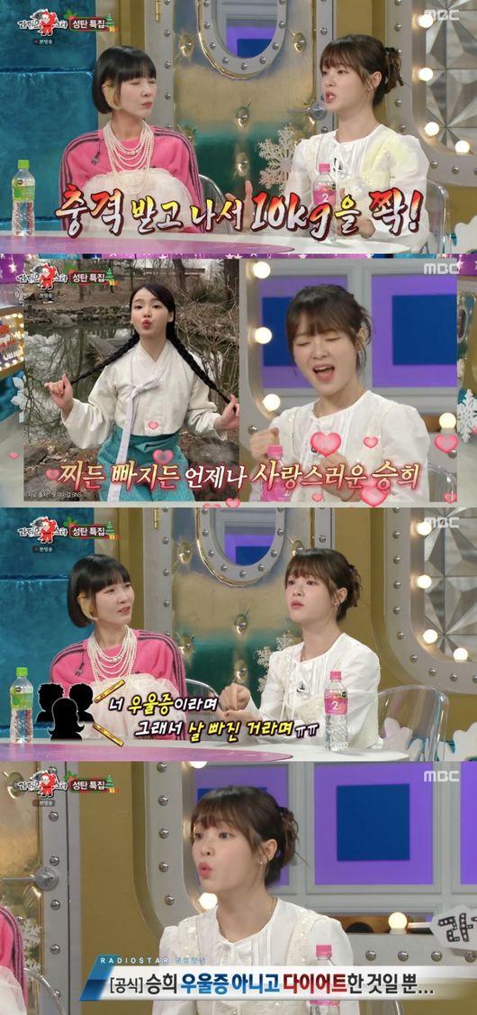 특히 승희는 10kg를 빼면서 우울증 오해를 받았었다며 “저보고 우울증이냐고 하더라. 집에 암막 커튼도 없고, 채광 너무 좋아한다. 지인들도 SNS로 너 우울증이라며 그동안 그래서 살 빠진 거라며 계속 오더라. 그래서 이 자리를 빌어서 우울증이 아니고 제 자체적으로 충격 먹어서 뺀 거다”라고 해명했다.