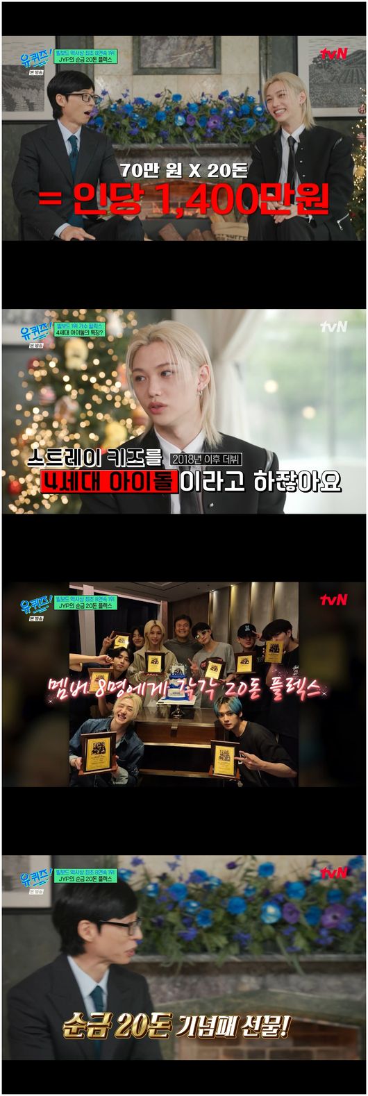 유재석은 “전 세계를 씹어먹는다 한다. 빌보드 200 8회 연속 1위라고 한다. 빌보드 70년 역사상 최초라고 한다”라며 ‘스트레이 키즈’의 역대급 성적에 대해 언급했다. 유재석은 “JYP 박진영이 금 20돈씩 선물했다고 하는데”라며 물었다. 필릭스는 “그때 먹는 자리에서 밥을 먹다가 박진영이 선물을 줄 게 있다고 하더라. 금을 주는데, 빌보드 1위 기념 모양으로 해서 예쁘게 포장이 됐더라”라면서 수줍게 웃었다.