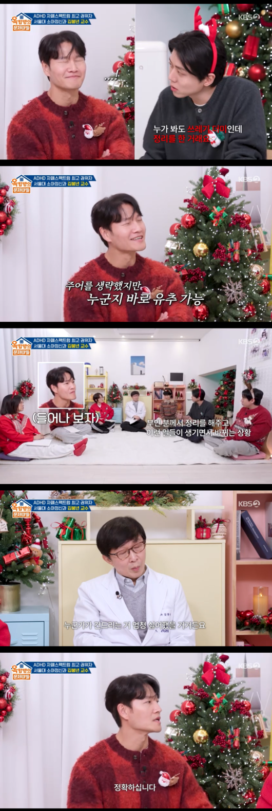 주우재는 "누가 봐도 쓰레기 더미인데 본인은 정리를 한 것이라고 우기는 사람이 있다"며 평소 김종국의 독특한 정리 습관을 폭로했다. 이어 "그런데 결혼 후 부인분이 정리를 해주고 상황이 바뀌면서 (김종국이) 예전과는 다른 모습을 보이고 있다"고 덧붙였다.