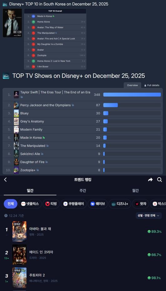 특히 키노라이츠에서 디즈니의 영화, 시리즈인 '아바타: 불과 재', '메이드 인 코리아', '주토피아 2'가 나란히 1~3위를 휩쓸며 연말 콘텐츠 트렌드를 견인하고 있다는 점에서 더욱 의미가 깊다. 여기에, 세계적인 콘텐츠 데이터베이스 사이트 IMDb에서 9.1이라는 유례없는 높은 평점을 유지하며 이번주 봐야 할 신작 시리즈 5편 중 하나로 소개됨은 물론, 네이버 오픈톡 1위에 오르는 등 독보적인 존재감을 각인시켰다. 또한, 26일 기준 왓챠피디아 ‘HOT 랭킹’에서도 1위에 오르며 '메이드 인 코리아'가 이어갈 화제 행보에 관심이 집중되고 있다.