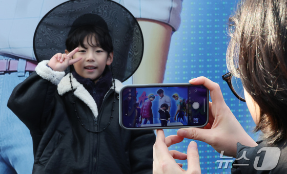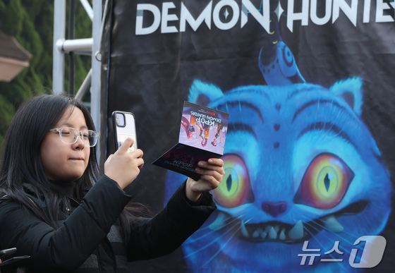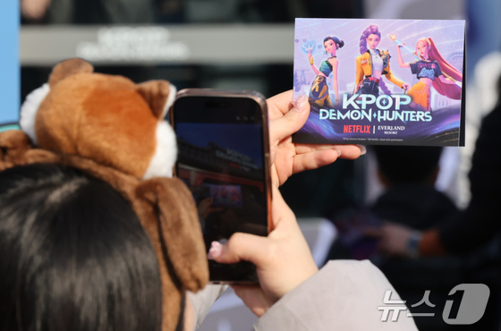 경기 용인시 에버랜드 내 케이팝 데몬 헌터스 팝업존을 찾은 관람객이 행사장을 촬영하고 있다. © News1 장수영 기자