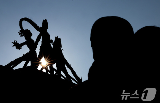 경기 용인시 에버랜드 내 케이팝 데몬 헌터스 팝업존을 찾은 관람객들이 갓 모자를 든 모습의 그림자를 만들고 있다. © News1 장수영 기자