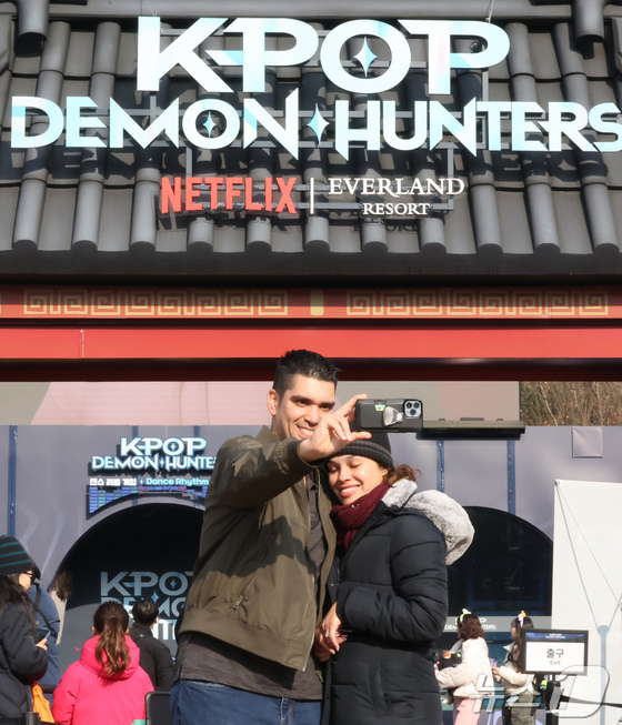 경기 용인시 에버랜드 내 케이팝 데몬 헌터스 팝업존을 찾은 외국인 관람객들이 기념촬영하고 있다. © News1 장수영 기자