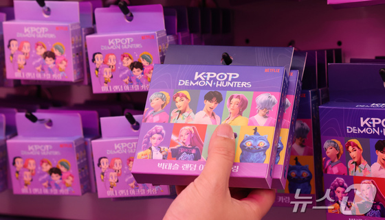 경기 용인시 에버랜드 내 케이팝 데몬 헌터스 팝업존을 찾은 관람객이 굿즈를 구매하고 있다. © News1 장수영 기자